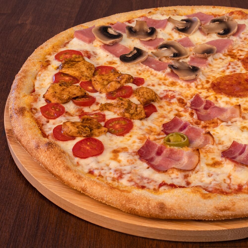 Томатный соус. Сыр Моцарелла. Бекон. Ветчина. Курица. Пепперони. Томаты Черри. Специи.