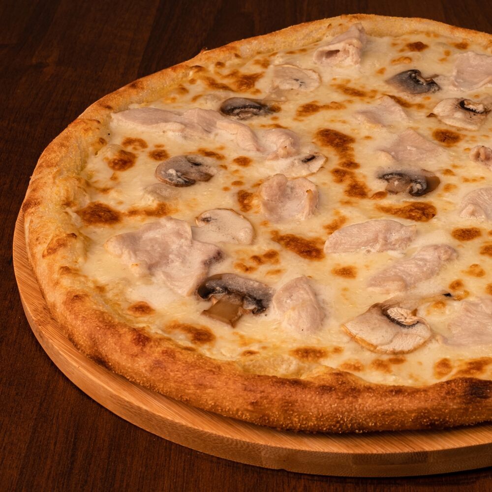 Сливочный соус. Сыр Моцарелла. Курица. Шампиньоны.
