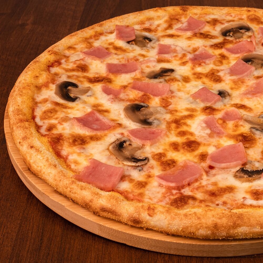 Томатный соус. Сыр Моцарелла. Шампиньоны. Ветчина. Специи.
