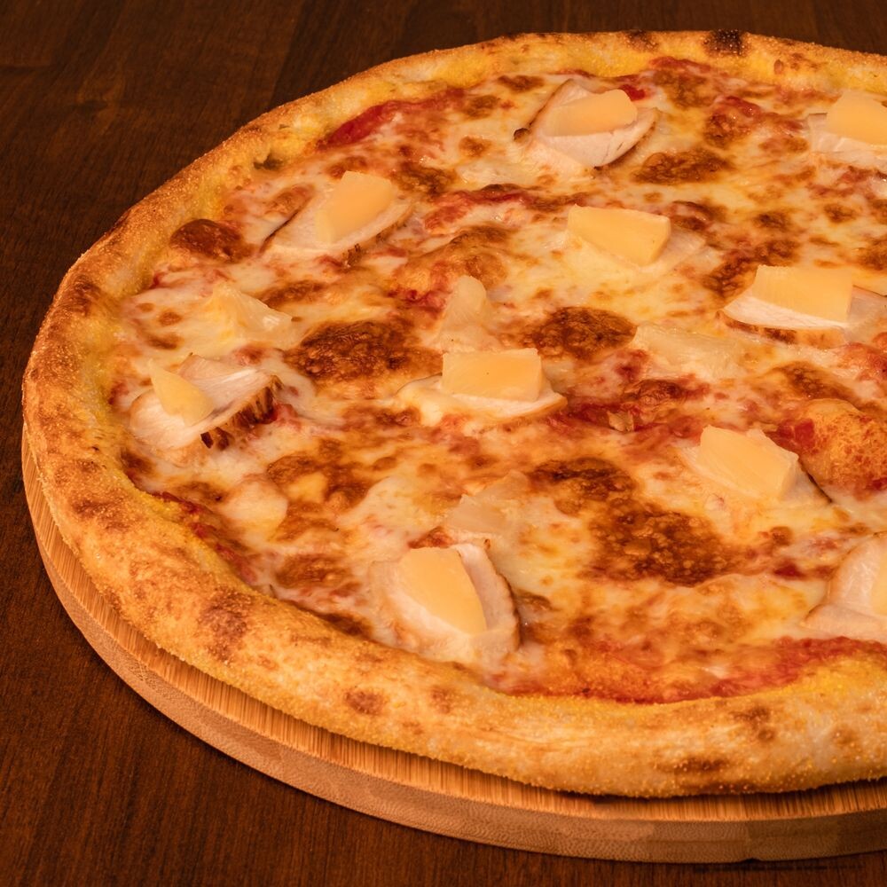 Томатный соус. Сыр Моцарелла. Куриная грудка. Ананасы. Специи.