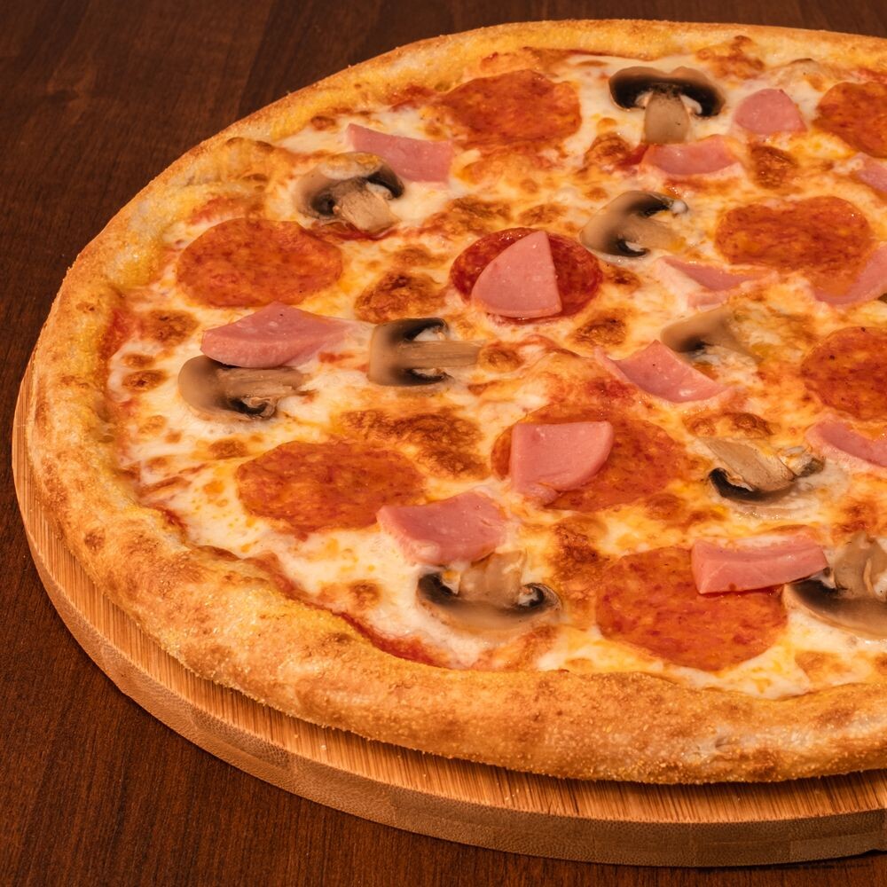 Томатный соус. Сыр Моцарелла. Пепперони. Ветчина. Шампиньоны. Специи.